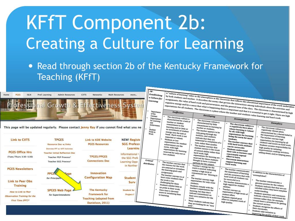 KFfT Component 2b: Creating a Culture for Learning • Read through section 2b of the Kentucky Framework for Teaching (KFfT)
