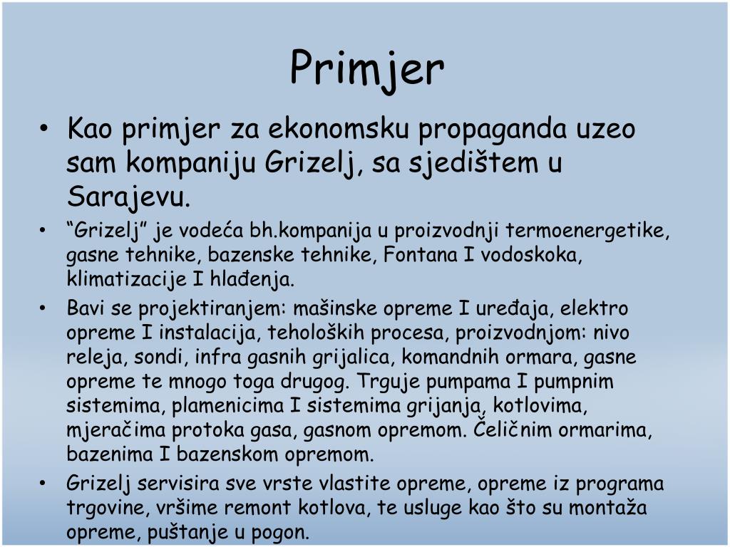 Primjer Kao primjer za ekonomsku propaganda uzeo sam kompaniju Grizelj, sa sjedištem u Sarajevu. “Grizelj” je vodeća bh.kompanija u proizvodnji termoenergetike, gasne tehnike, bazenske tehnike, Fontana I vodoskoka, klimatizacije I hlađenja. Bavi se projektiranjem: mašinske opreme I uređaja, elektro opreme I instalacija, teholoških procesa, proizvodnjom: nivo releja, sondi, infra gasnih grijalica, komandnih ormara, gasne opreme te mnogo toga drugog. Trguje pumpama I pumpnim sistemima, plamenicima I sistemima grijanja, kotlovima, mjeračima protoka gasa, gasnom opremom. Čeličnim ormarima, bazenima I bazenskom opremom. Grizelj servisira sve vrste vlastite opreme, opreme iz programa trgovine, vršime remont kotlova, te usluge kao što su montaža opreme, puštanje u pogon.