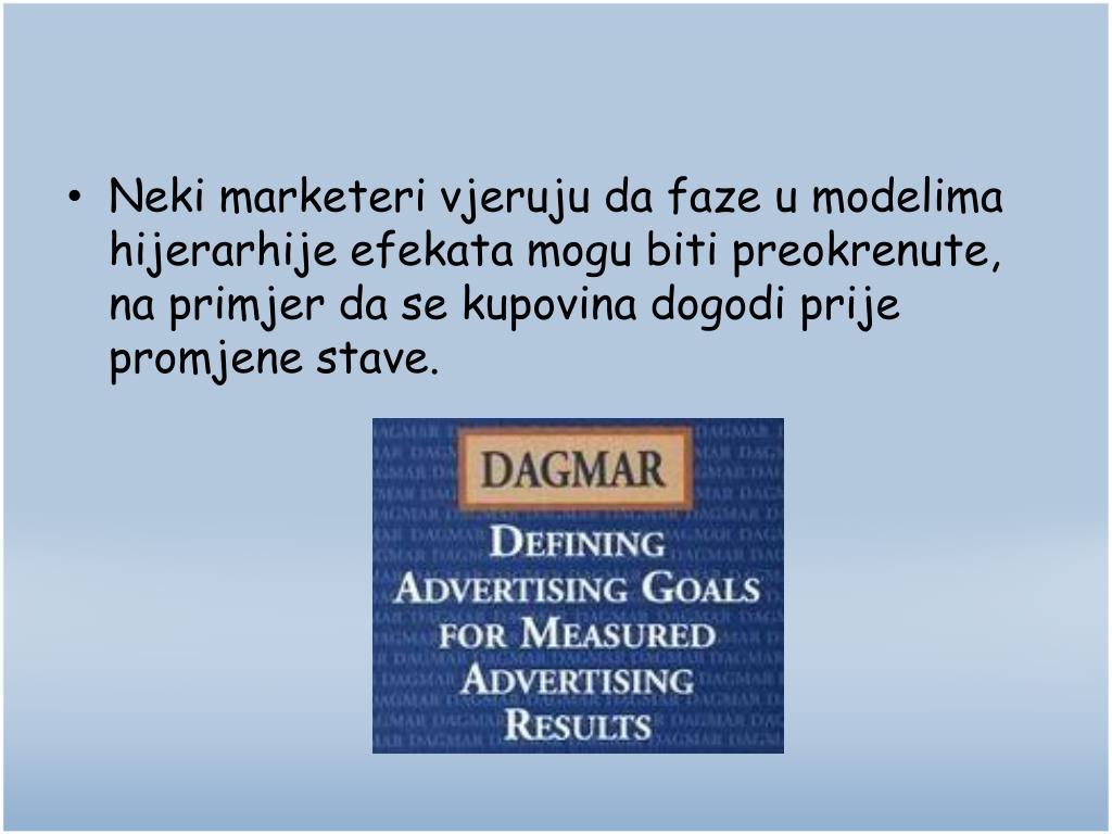DAGMAR Defining Advertising Goals for Measured Advertising Results”( Postavljanje propagandnih ciljeva za mjerljive propagandne rezultate) DAGMAR model sugeriše da bi dobri propagandni ciljevi trebalo da bude: konkuretni i mjerljivi određeni ciljnim tržištem vremenski specificirani usmjereni za izgrađivanje marke i postavljeni tako da ukazuju na steepen promjene tražnje.