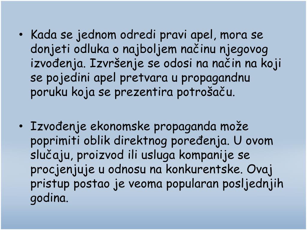 Kada se jednom odredi pravi apel, mora se donjeti odluka o najboljem načinu njegovog izvođenja. Izvršenje se odosi na način na koji se pojedini apel pretvara u propagandnu poruku koja se prezentira potrošaču. Izvođenje ekonomske propaganda može poprimiti oblik direktnog poređenja. U ovom slučaju, proizvod ili usluga kompanije se procjenjuje u odnosu na konkurentske. Ovaj pristup postao je veoma popularan posljednjih godina.