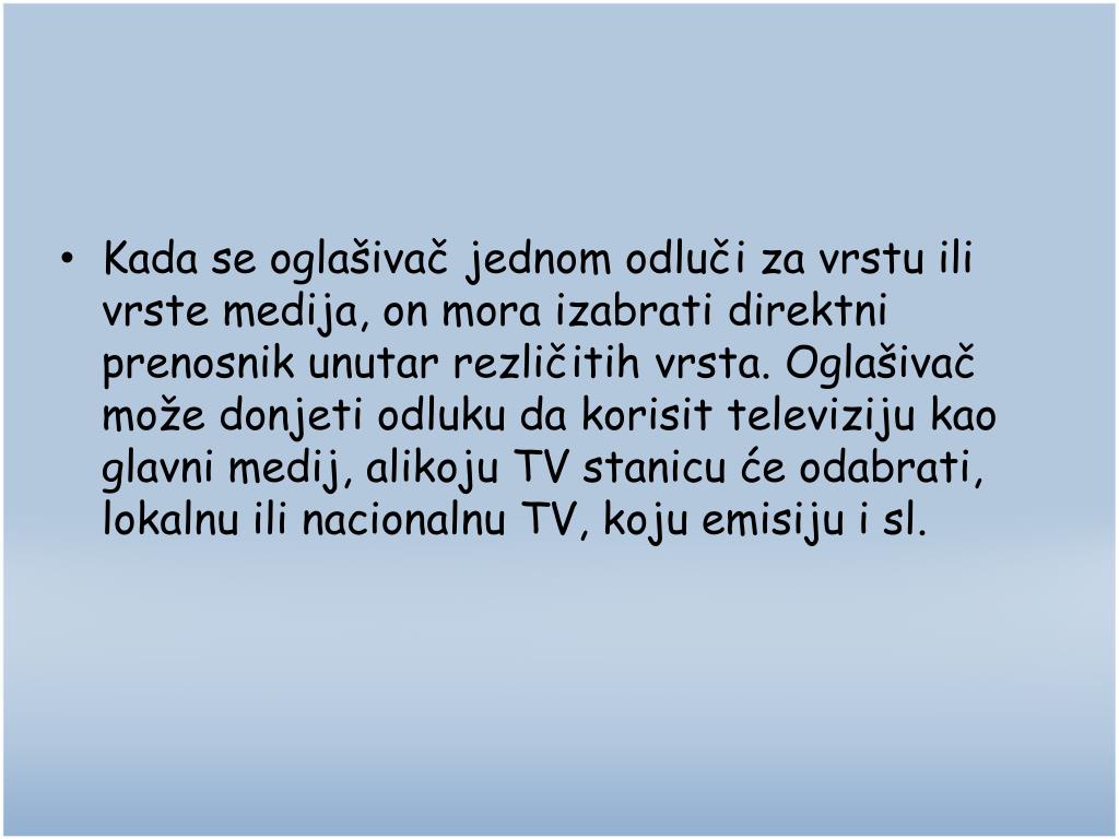 Izbor medija Izbor medija je prilično sloen zadatak. Medija-plan za proizvode ili usluge uključuje sljedeće odluke: Vrste medija koji će biti korišteni – hoče li prizvod biti oglašavan na televiziji, radiju, u časopisima, novinama, putem direktne pošte ili spoljne propagande ? Direktni prenosnici (vehikuli) koji će biti korišteni-koja televizijska stanica i program, koja radio stanica i program, koji specifični časopis i rubrika će biti korišteni ? Broj oglasa-koliko mnogo pojedinaćni oglasa će se pojaviti u svakom direktnom prenosniku ?