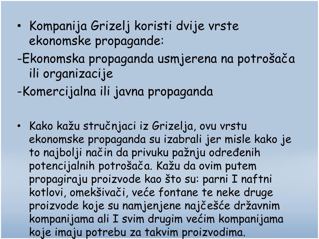 Kompanija Grizelj koristi dvije vrste ekonomske propagande: -Ekonomska propaganda usmjerena na potrošača ili organizacije -Komercijalna ili javna propaganda Kako kažu stručnjaci iz Grizelja, ovu vrstu ekonomske propaganda su izabrali jer misle kako je to najbolji način da privuku pažnju određenih potencijalnih potrošača. Kažu da ovim putem propagiraju proizvode kao što su: parni I naftni kotlovi, omekšivači, veće fontane te neke druge proizvode koje su namjenjene najčešće državnim kompanijama ali I svim drugim većim kompanijama koje imaju potrebu za takvim proizvodima.