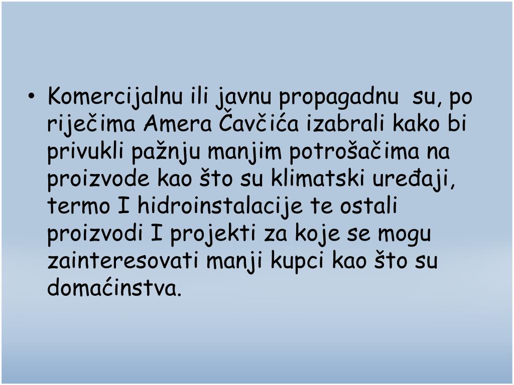 Komercijalnu ili javnu propagadnu su, po riječima Amera Čavčića izabrali kako bi privukli pažnju manjim potrošačima na proizvode kao što su klimatski uređaji, termo I hidroinstalacije te ostali proizvodi I projekti za koje se mogu zainteresovati manji kupci kao što su domaćinstva.