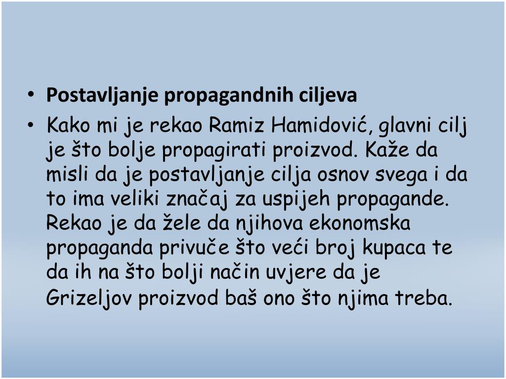 Postavljanje propagandnih ciljeva Kako mi je rekao Ramiz Hamidović, glavni cilj je što bolje propagirati proizvod. Kaže da misli da je postavljanje cilja osnov svega i da to ima veliki značaj za uspijeh propagande. Rekao je da žele da njihova ekonomska propaganda privuče što veći broj kupaca te da ih na što bolji način uvjere da je Grizeljov proizvod baš ono što njima treba.