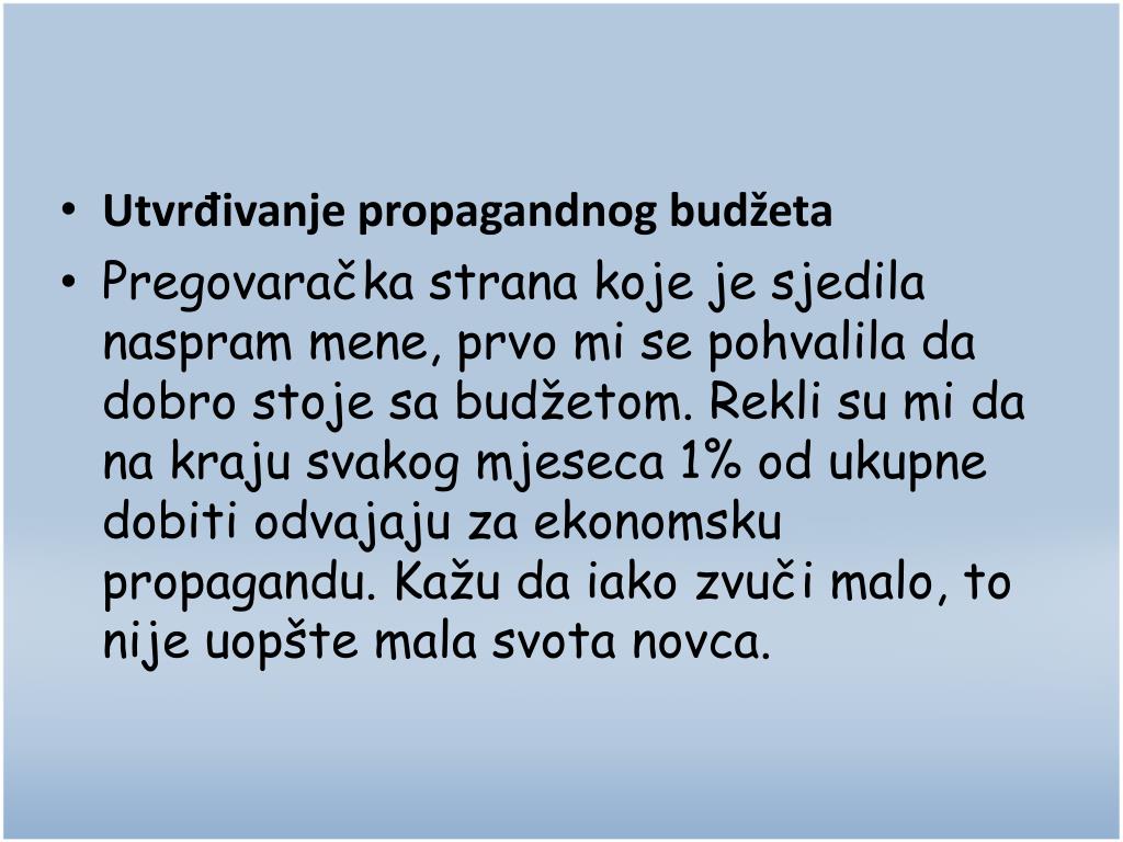 Utvrđivanje propagandnog budžeta Pregovaračka strana koje je sjedila naspram mene, prvo mi se pohvalila da dobro stoje sa budžetom. Rekli su mi da na kraju svakog mjeseca 1% od ukupne dobiti odvajaju za ekonomsku propagandu. Kažu da iako zvuči malo, to nije uopšte mala svota novca.