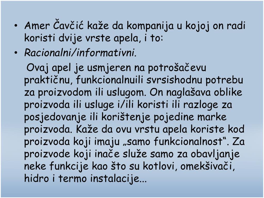 Amer Čavčić kaže da kompanija u kojoj on radi koristi dvije vrste apela, i to: Racionalni/informativni. Ovaj apel je usmjeren na potrošačevu praktičnu, funkcionalnuili svrsishodnu potrebu za proizvodom ili uslugom. On naglašava oblike proizvoda ili usluge i/ili koristi ili razloge za posjedovanje ili korištenje pojedine marke proizvoda. Kaže da ovu vrstu apela koriste kod proizvoda koji imaju „samo funkcionalnost“. Za proizvode koji inače služe samo za obavljanje neke funkcije kao što su kotlovi, omekšivači, hidro i termo instalacije...