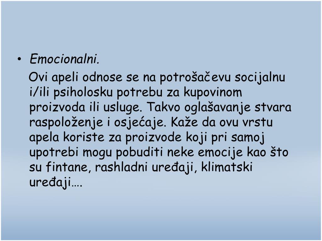 Emocionalni. Ovi apeli odnose se na potrošačevu socijalnu i/ili psiholosku potrebu za kupovinom proizvoda ili usluge. Takvo oglašavanje stvara raspoloženje i osjećaje. Kaže da ovu vrstu apela koriste za proizvode koji pri samoj upotrebi mogu pobuditi neke emocije kao što su fintane, rashladni uređaji, klimatski uređaji….