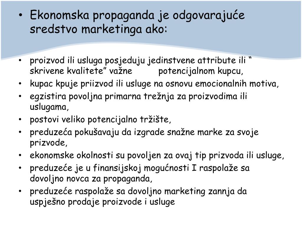 Ekonomska propaganda je odgovarajuće sredstvo marketinga ako: • proizvod ili usluga posjeduju jedinstvene attribute ili “ skrivene kvalitete” važne potencijalnom kupcu, • kupac kpuje priizvod ili usluge na osnovu emocionalnih motiva, • egzistira povoljna primarna trežnja za proizvodima ili uslugama, • postovi veliko potencijalno tržište, • preduzeća pokušavaju da izgrade snažne marke za svoje prizvode, • ekonomske okolnosti su povoljen za ovaj tip prizvoda ili usluge, • preduzeće je u finansijskoj mogućnosti I raspolaže sa dovoljno novca za propaganda, • preduzeće raspolaže sa dovoljno marketing zannja da uspješno prodaje proizvode i usluge