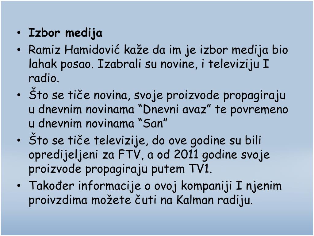 Izbor medija Ramiz Hamidović kaže da im je izbor medija bio lahak posao. Izabrali su novine, i televiziju I radio. Što se tiče novina, svoje proizvode propagiraju u dnevnim novinama “Dnevni avaz” te povremeno u dnevnim novinama “San” Što se tiče televizije, do ove godine su bili opredijeljeni za FTV, a od 2011 godine svoje proizvode propagiraju putem TV1. Također informacije o ovoj kompaniji I njenim proivzdima možete čuti na Kalman radiju.