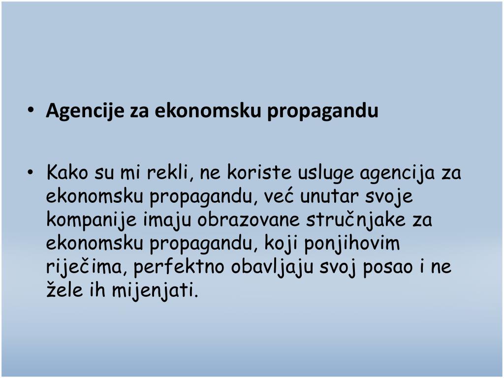 Agencije za ekonomsku propagandu • Neke velike kompanije imaju razvijene sve funkcije neophodne za planiranje, provodjenje i kontrolu propagandnih aktivnosti. • Najčešće usluge koje kompanije uzimaju od prppagandnih agencija su: • Kreativne usluge planiranja i izrade propagandnih sredstava. • Usluge planiranja i zakupna medija.