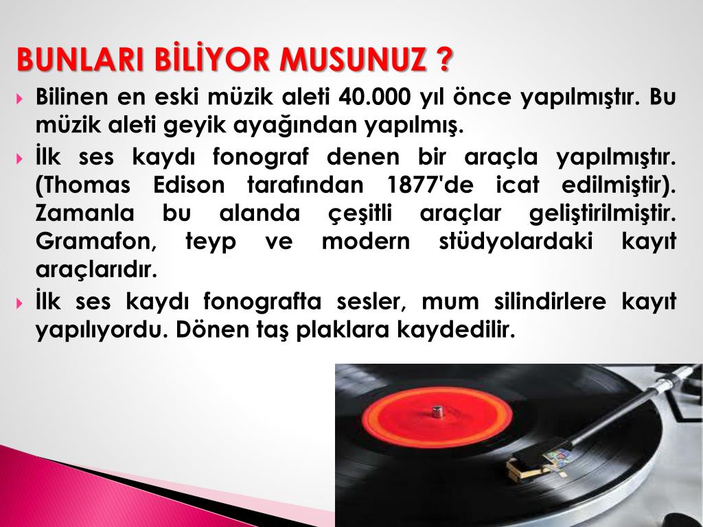 BUNLARI BİLİYOR MUSUNUZ ? • Bilinen en eski müzik aleti 40.000 yıl önce yapılmıştır. Bu müzik aleti geyik ayağından yapılmış. • İlk ses kaydı fonograf denen bir araçla yapılmıştır. (Thomas Edison tarafından 1877'de icat edilmiştir). Zamanla bu alanda çeşitli araçlar geliştirilmiştir. Gramafon, teyp ve modern stüdyolardaki kayıt araçlarıdır. • İlk ses kaydı fonografta sesler, mum silindirlere kayıt yapılıyordu. Dönen taş plaklara kaydedilir.