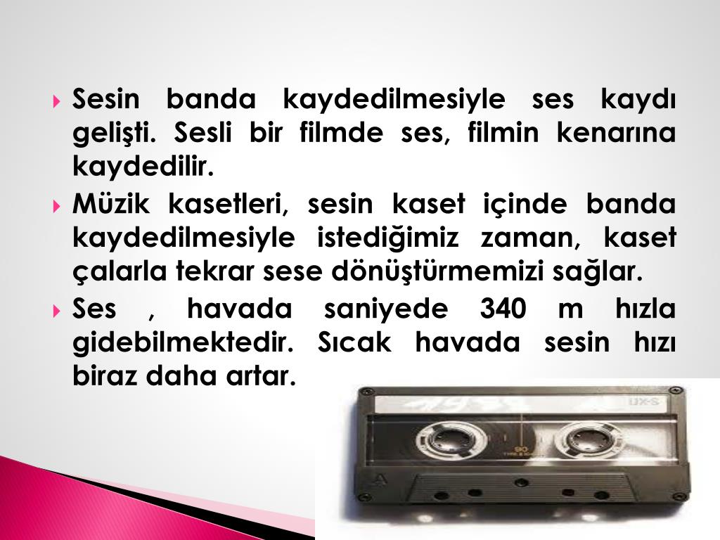 Sesin banda kaydedilmesiyle ses kaydı gelişti. Sesli bir filmde ses, filmin kenarına kaydedilir. • Müzik kasetleri, sesin kaset içinde banda kaydedilmesiyle istediğimiz zaman, kaset çalarla tekrar sese dönüştürmemizi sağlar. • Ses , havada saniyede 340 m hızla gidebilmektedir. Sıcak havada sesin hızı biraz daha artar.