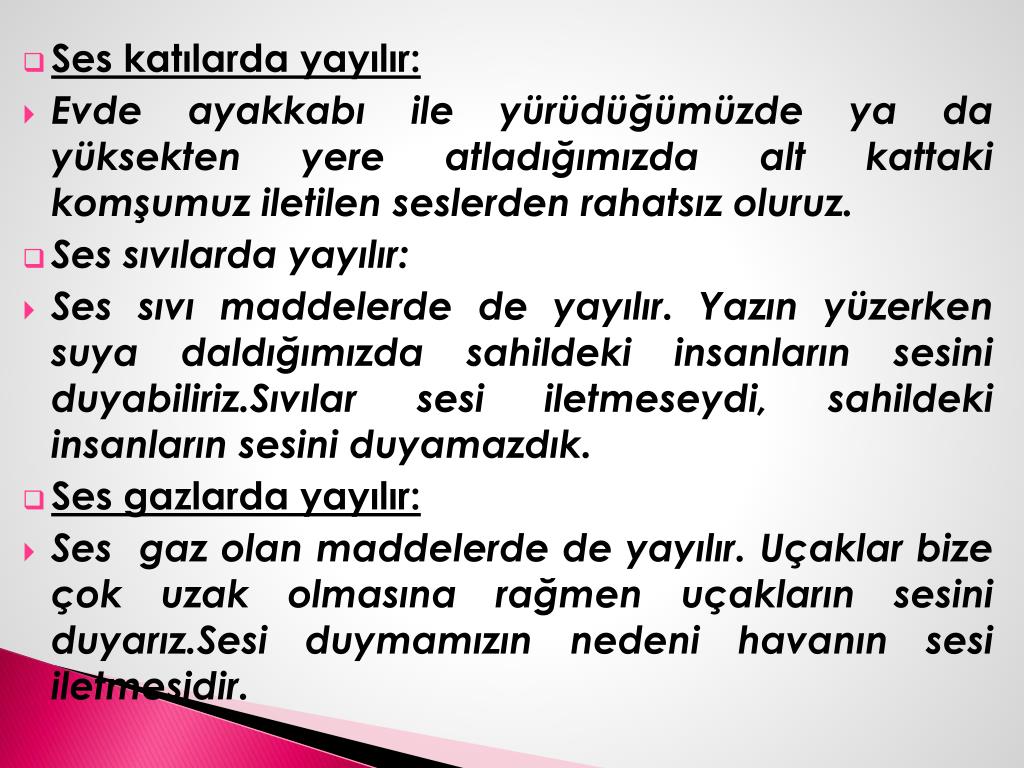 Ses katılarda yayılır: • Evde ayakkabı ile yürüdüğümüzde ya da yüksekten yere atladığımızda alt kattaki komşumuz iletilen seslerden rahatsız oluruz. • Ses sıvılarda yayılır: • Ses sıvı maddelerde de yayılır. Yazın yüzerken suya daldığımızda sahildeki insanların sesini duyabiliriz.Sıvılar sesi iletmeseydi, sahildeki insanların sesini duyamazdık. • Ses gazlarda yayılır: • Ses gaz olan maddelerde de yayılır. Uçaklar bize çok uzak olmasına rağmen uçakların sesini duyarız.Sesi duymamızın nedeni havanın sesi iletmesidir.
