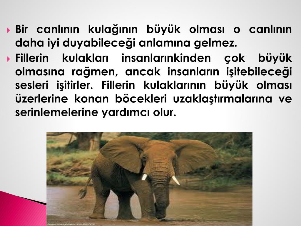 Bir canlının kulağının büyük olması o canlının daha iyi duyabileceği anlamına gelmez. • Fillerin kulakları insanlarınkinden çok büyük olmasına rağmen, ancak insanların işitebileceği sesleri işitirler. Fillerin kulaklarının büyük olması üzerlerine konan böcekleri uzaklaştırmalarına ve serinlemelerine yardımcı olur.