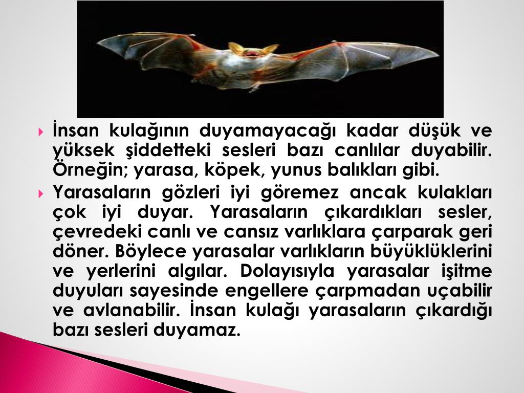İnsan kulağının duyamayacağı kadar düşük ve yüksek şiddetteki sesleri bazı canlılar duyabilir. Örneğin; yarasa, köpek, yunus balıkları gibi. • Yarasaların gözleri iyi göremez ancak kulakları çok iyi duyar. Yarasaların çıkardıkları sesler, çevredeki canlı ve cansız varlıklara çarparak geri döner. Böylece yarasalar varlıkların büyüklüklerini ve yerlerini algılar. Dolayısıyla yarasalar işitme duyuları sayesinde engellere çarpmadan uçabilir ve avlanabilir. İnsan kulağı yarasaların çıkardığı bazı sesleri duyamaz.