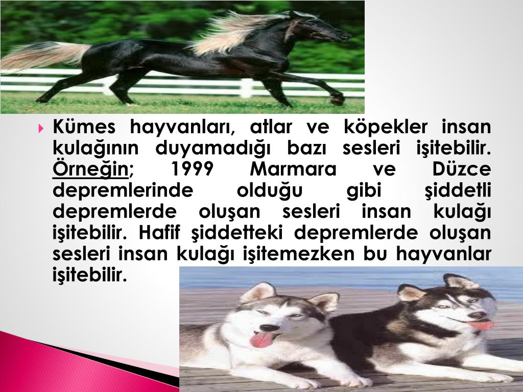 Kümes hayvanları, atlar ve köpekler insan kulağının duyamadığı bazı sesleri işitebilir. Örneğin; 1999 Marmara ve Düzce depremlerinde olduğu gibi şiddetli depremlerde oluşan sesleri insan kulağı işitebilir. Hafif şiddetteki depremlerde oluşan sesleri insan kulağı işitemezken bu hayvanlar işitebilir.