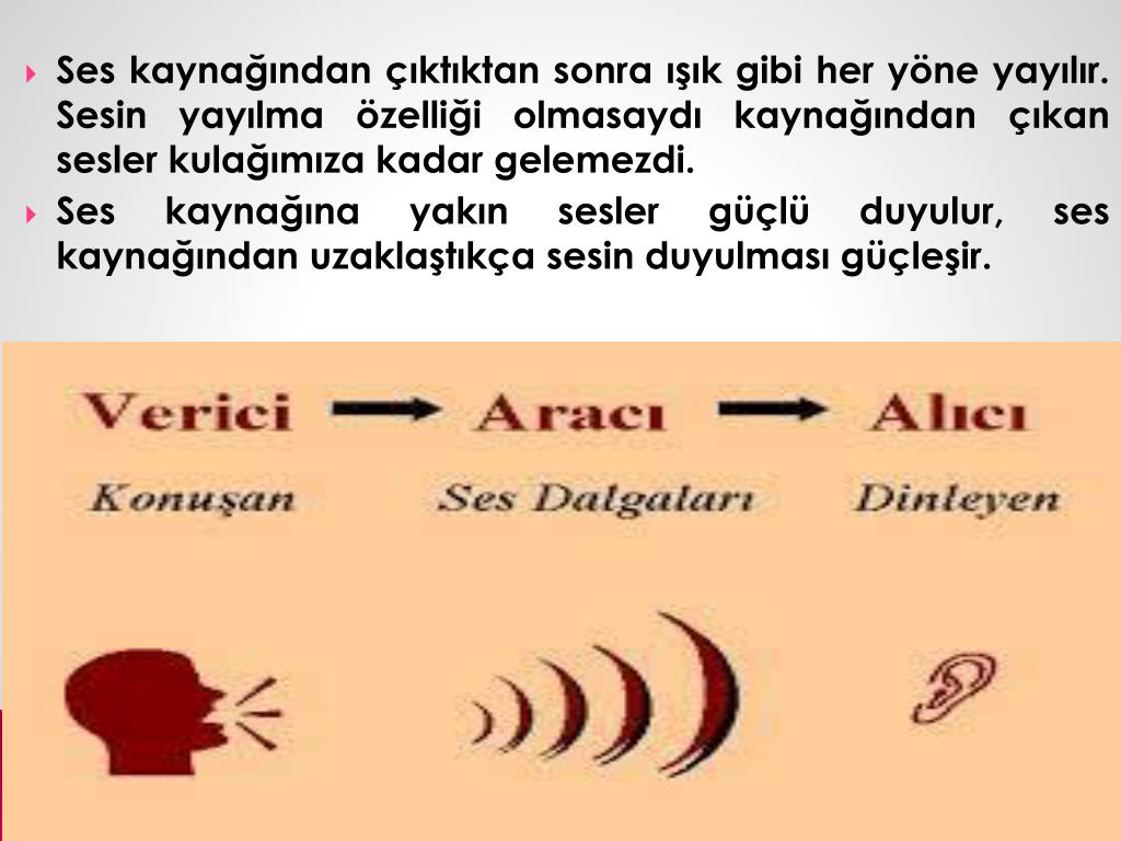 Ses kaynağından çıktıktan sonra ışık gibi her yöne yayılır. Sesin yayılma özelliği olmasaydı kaynağından çıkan sesler kulağımıza kadar gelemezdi. • Ses kaynağına yakın sesler güçlü duyulur, ses kaynağından uzaklaştıkça sesin duyulması güçleşir.