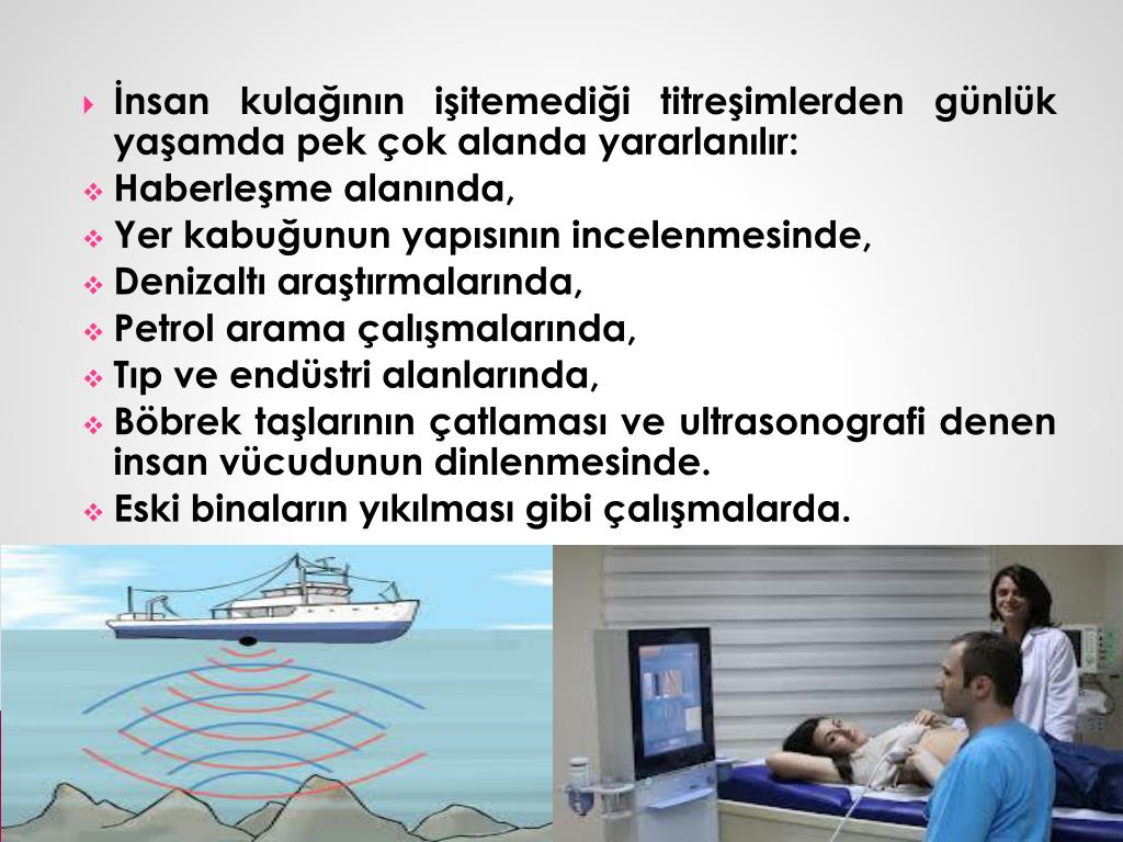 İnsan kulağının işitemediği titreşimlerden günlük yaşamda pek çok alanda yararlanılır: • Haberleşme alanında, • Yer kabuğunun yapısının incelenmesinde, • Denizaltı araştırmalarında, • Petrol arama çalışmalarında, • Tıp ve endüstri alanlarında, • Böbrek taşlarının çatlaması ve ultrasonografi denen insan vücudunun dinlenmesinde. • Eski binaların yıkılması gibi çalışmalarda.