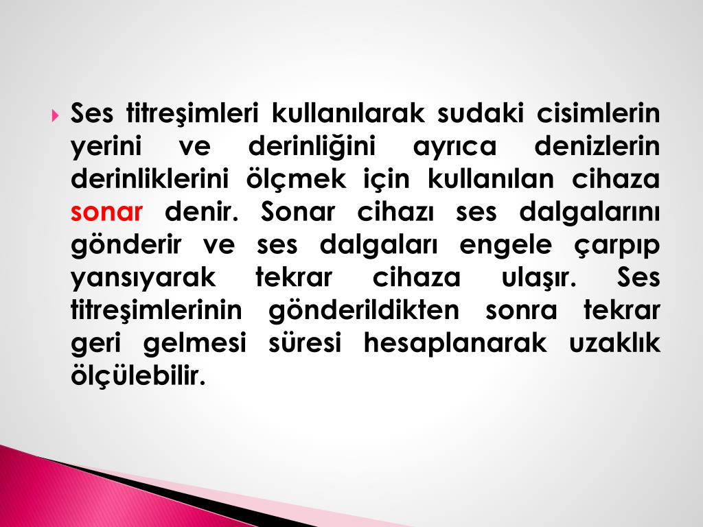 Ses titreşimleri kullanılarak sudaki cisimlerin yerini ve derinliğini ayrıca denizlerin derinliklerini ölçmek için kullanılan cihaza sonar denir. Sonar cihazı ses dalgalarını gönderir ve ses dalgaları engele çarpıp yansıyarak tekrar cihaza ulaşır. Ses titreşimlerinin gönderildikten sonra tekrar geri gelmesi süresi hesaplanarak uzaklık ölçülebilir.