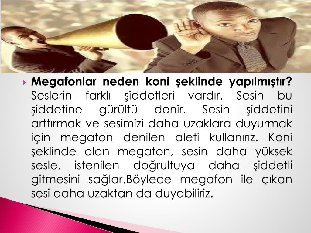 Megafonlar neden koni şeklinde yapılmıştır?Seslerin farklı şiddetleri vardır. Sesin bu şiddetine gürültü denir. Sesin şiddetini arttırmak ve sesimizi daha uzaklara duyurmak için megafon denilen aleti kullanırız. Koni şeklinde olan megafon, sesin daha yüksek sesle, istenilen doğrultuya daha şiddetli gitmesini sağlar.Böylece megafon ile çıkan sesi daha uzaktan da duyabiliriz.
