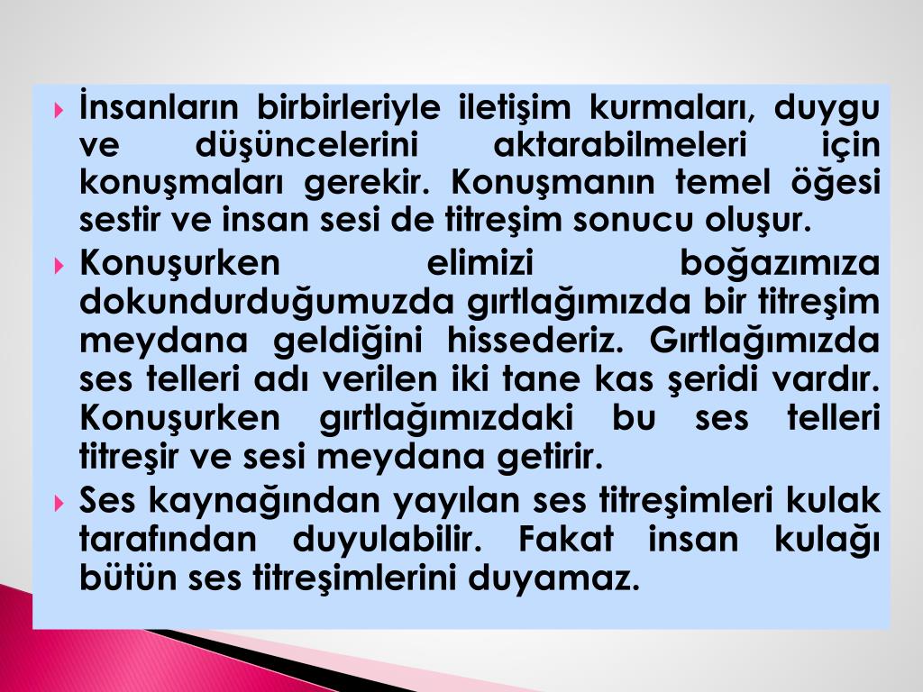 İnsanların birbirleriyle iletişim kurmaları, duygu ve düşüncelerini aktarabilmeleri için konuşmaları gerekir. Konuşmanın temel öğesi sestir ve insan sesi de titreşim sonucu oluşur. • Konuşurken elimizi boğazımıza dokundurduğumuzda gırtlağımızda bir titreşim meydana geldiğini hissederiz. Gırtlağımızda ses telleri adı verilen iki tane kas şeridi vardır. Konuşurken gırtlağımızdaki bu ses telleri titreşir ve sesi meydana getirir. • Ses kaynağından yayılan ses titreşimleri kulak tarafından duyulabilir. Fakat insan kulağı bütün ses titreşimlerini duyamaz.