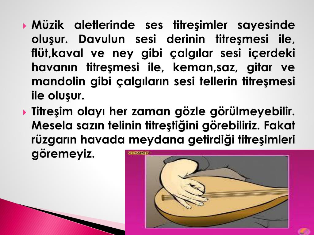 Müzik aletlerinde ses titreşimler sayesinde oluşur. Davulun sesi derinin titreşmesi ile, flüt,kaval ve ney gibi çalgılar sesi içerdeki havanın titreşmesi ile, keman,saz, gitar ve mandolin gibi çalgıların sesi tellerin titreşmesi ile oluşur. • Titreşim olayı her zaman gözle görülmeyebilir. Mesela sazın telinin titreştiğini görebiliriz. Fakat rüzgarın havada meydana getirdiği titreşimleri göremeyiz.