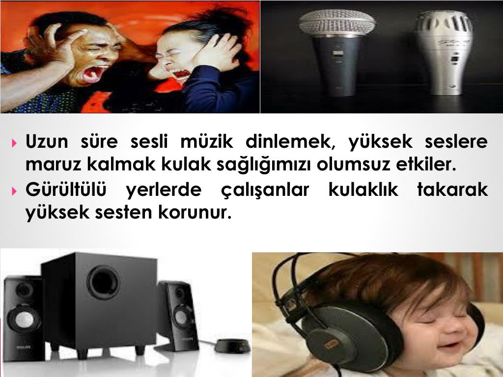 Uzun süre sesli müzik dinlemek, yüksek seslere maruz kalmak kulak sağlığımızı olumsuz etkiler. • Gürültülü yerlerde çalışanlar kulaklık takarak yüksek sesten korunur.