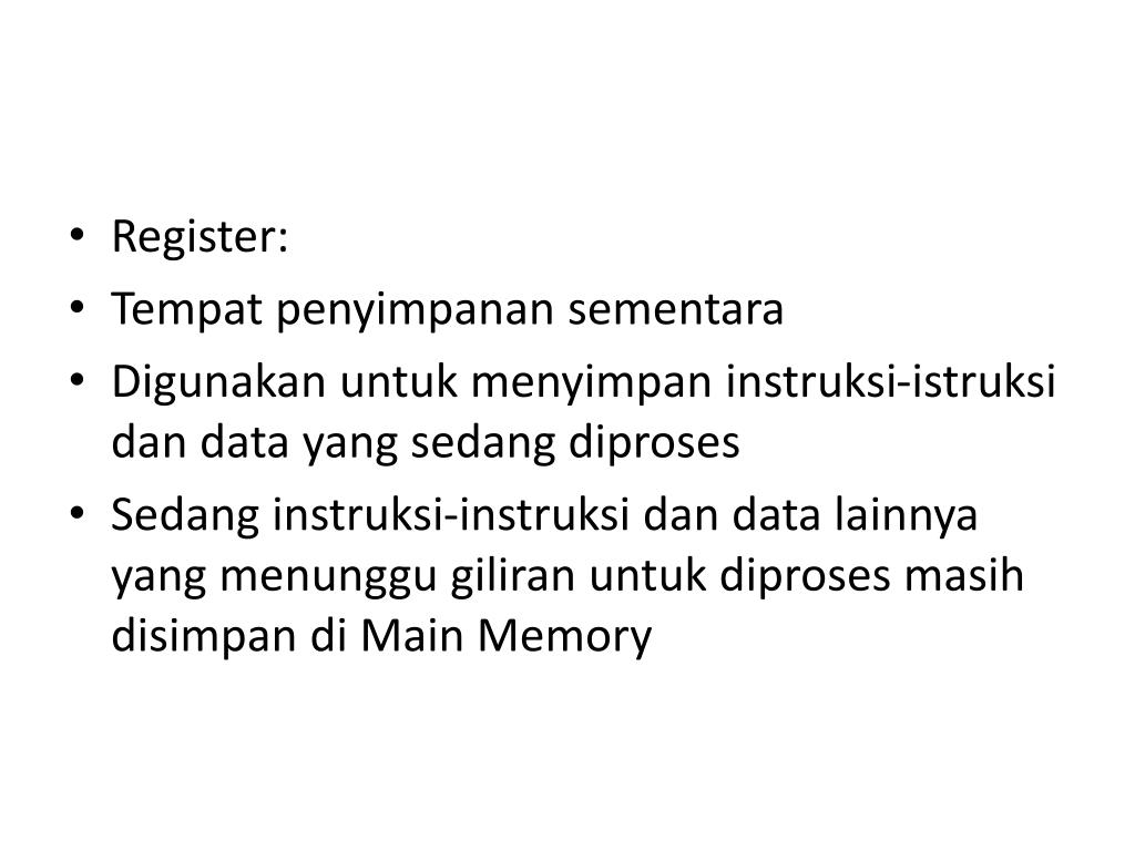 Register: • Tempat penyimpanan sementara • Digunakan untuk menyimpan instruksi-istruksi dan data yang sedang diproses • Sedang instruksi-instruksi dan data lainnya yang menunggu giliran untuk diproses masih disimpan di Main Memory