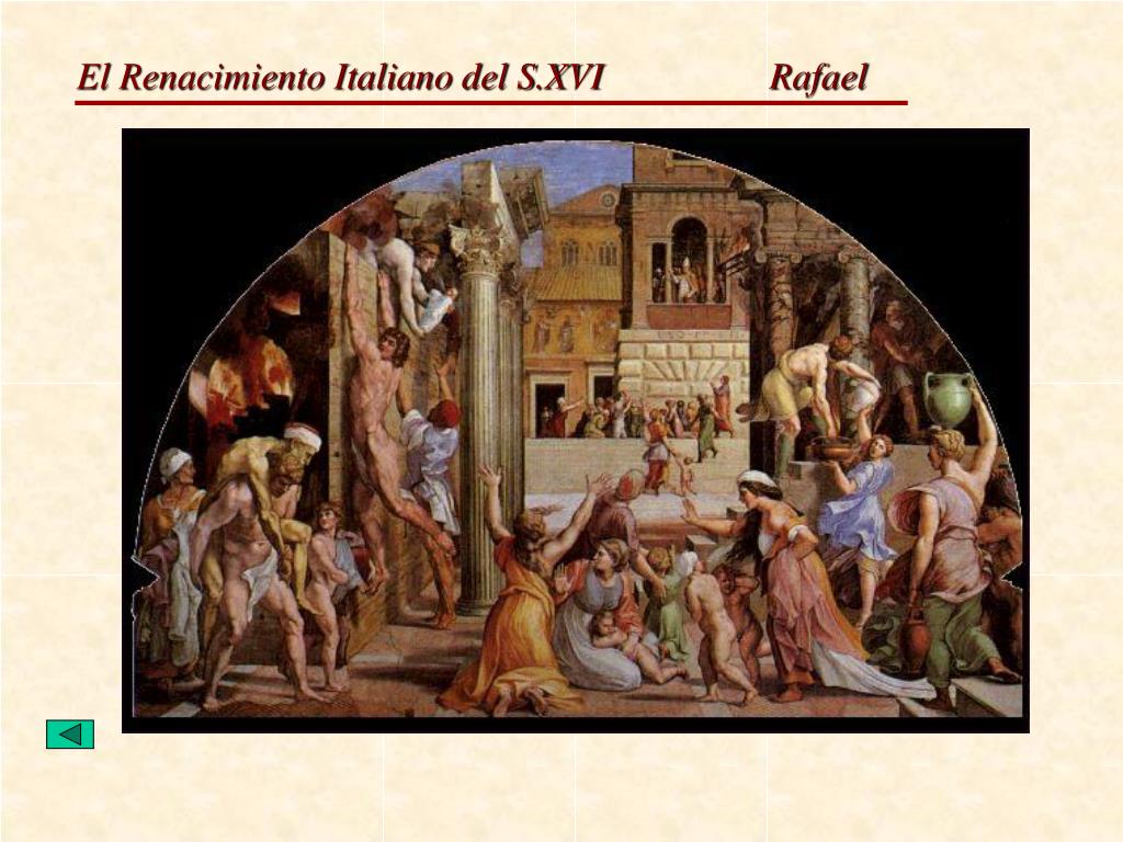 · Cuatro periodos: · Urbino hasta los 18 años. Aprendizaje · Perugia hasta los 21. Inicio · Florencia hasta los 25. Desarrollo · Roma hasta los 37. Madurez · 1483-1520. Murió con 37 años pero su obra es extensa. De los tres él era el pintor · Clasicismo puro. Sintetiza el color de Leonardo y el dibujo de Miguel Ángel. Colores claros y delicados Pintura Rafael · La Madona del jilguero: Tema de moda (Florencia de los Medicis después de Savonarola, belleza sin trasfondo). Hizo 15 madonas. Influjo leonardesco en cara y manos, esfumatos, eje. · La Escuela de Atenas: Estancias vaticanas: El Incendio, La Asignatura, De Heliodoro y de Constantino. El Tema, la arquitectura, los personajes en dos grupos Obras: · El Incendio del Vorgo: Rafael manierista: el tema relegado al fondo y lateral, angustia en el espacio, dibujo deformado