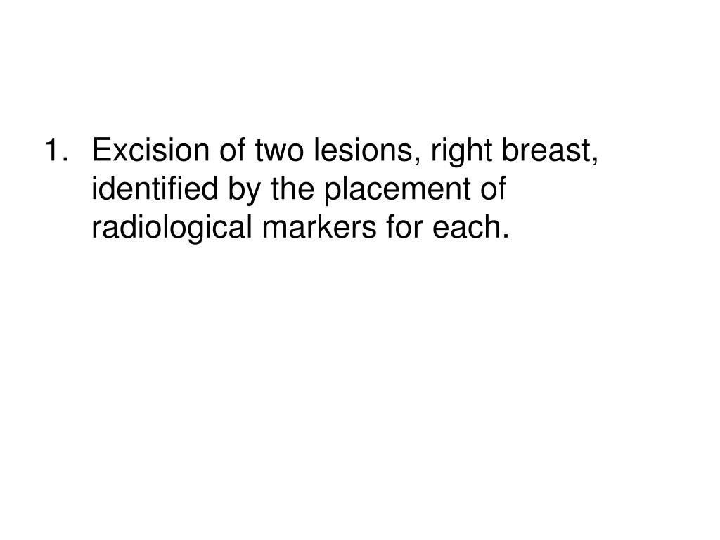 Excision of two lesions, right breast, identified by the placement of radiological markers for each.