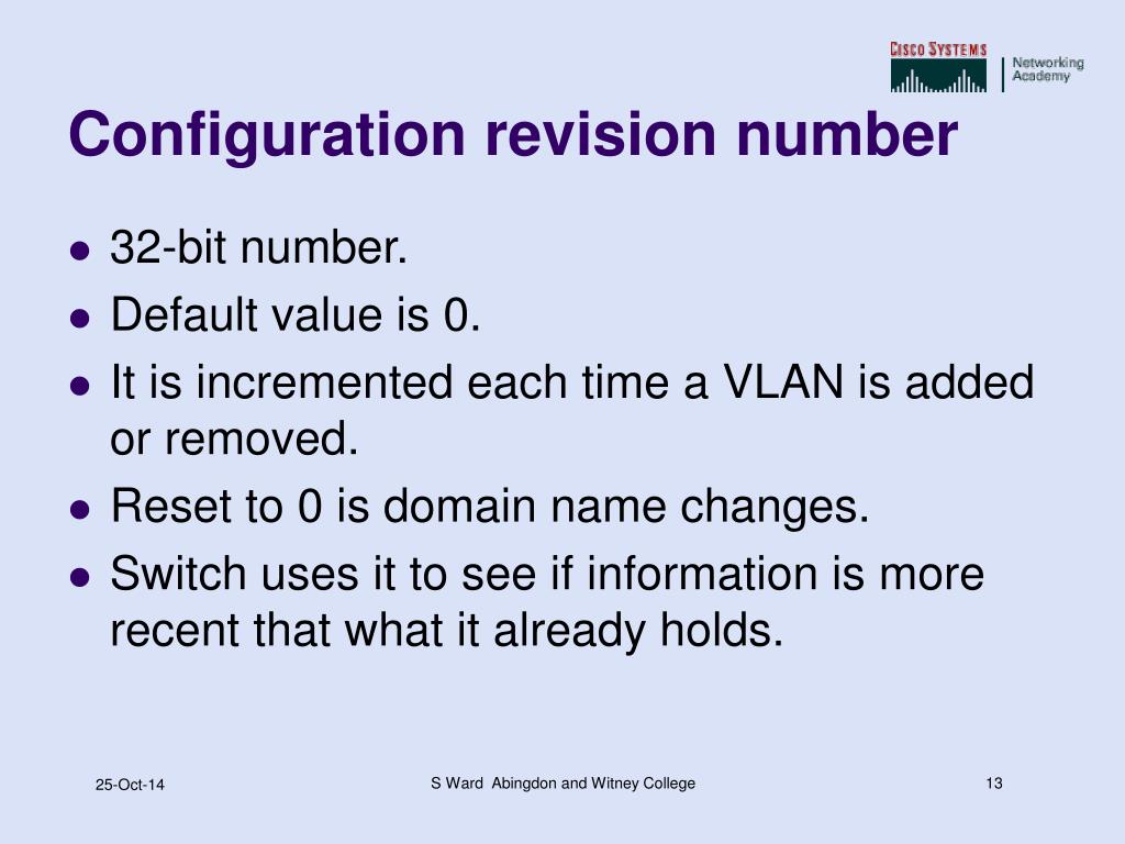 Configuration revision number • 32-bit number. • Default value is 0. • It is incremented each time a VLAN is added or removed. • Reset to 0 is domain name changes. • Switch uses it to see if information is more recent that what it already holds. S Ward Abingdon and Witney College