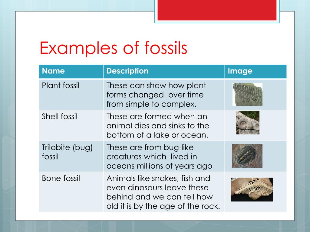What are fossils? • A fossil is an imprint that’s left behind by a plant or animal that lived long ago. • Fossils can be found in stone, frozen ground, or amber. amber stone frozen ground