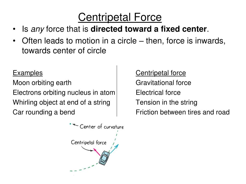 Centripetal Force • Is any force that is directed toward afixed center. • Often leads to motion in a circle – then, force is inwards, towards center of circle ExamplesCentripetal force Moon orbiting earth Gravitational force Electrons orbiting nucleus in atom Electrical force Whirling object at end of a string Tension in the string Car rounding a bend Friction between tires and road