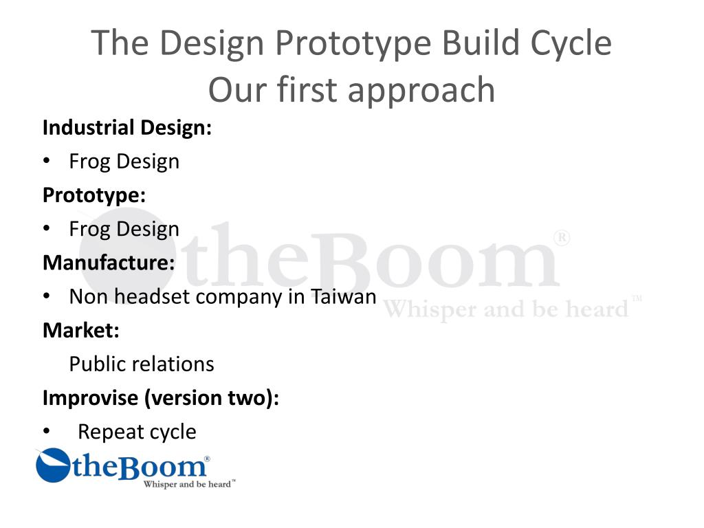 The Design Prototype Build CycleOur first approach Industrial Design: • Frog Design Prototype: • Frog Design Manufacture: • Non headset company in Taiwan Market: Public relations Improvise (version two): • Repeat cycle