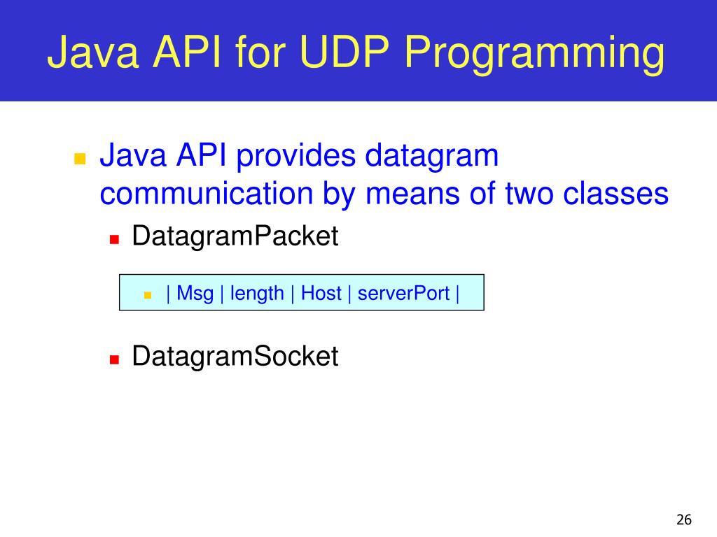Java API for UDP Programming • Java API provides datagram communication by means of two classes • DatagramPacket • DatagramSocket • | Msg | length | Host | serverPort |