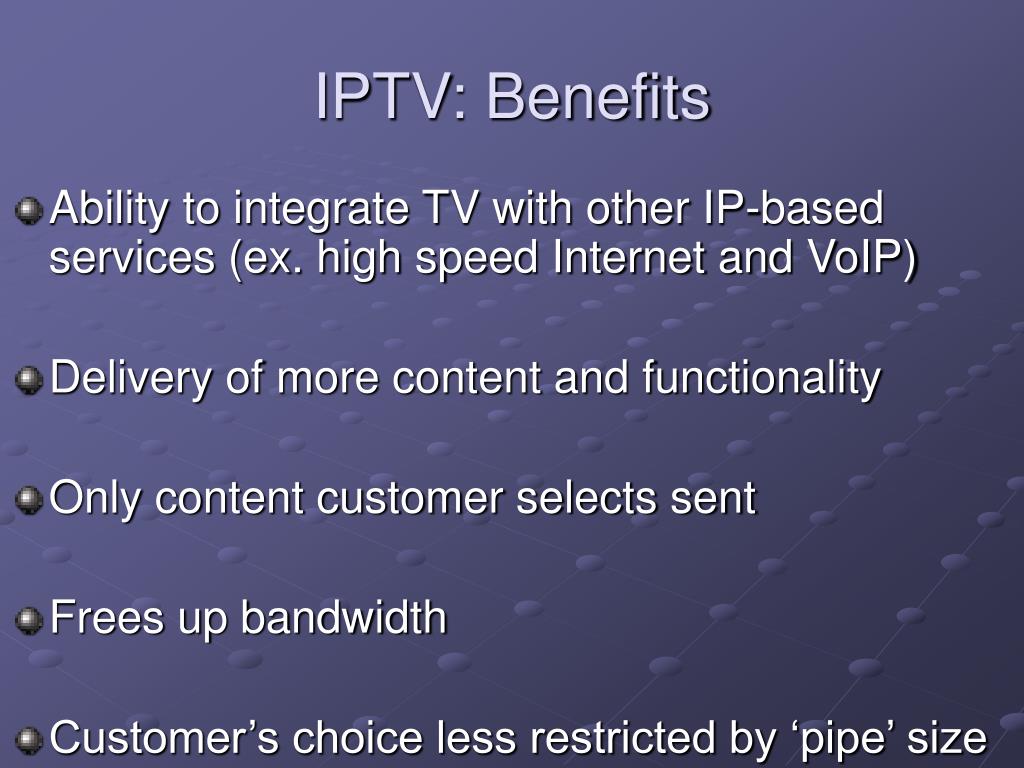 IPTV: Benefits • Ability to integrate TV with other IP-based services (ex. high speed Internet and VoIP) • Delivery of more content and functionality • Only content customer selects sent • Frees up bandwidth • Customer’s choice less restricted by ‘pipe’ size