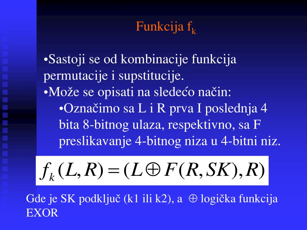 Funkcija fk • Sastoji se od kombinacije funkcija permutacije i supstitucije. • Mo`e se opisati na slede}o na~in: • Ozna~imo sa L i R prva I poslednja 4 bita 8-bitnog ulaza, respektivno, sa F preslikavanje 4-bitnog niza u 4-bitni niz. Gde je SK podklju~ (k1 ili k2), a logi~ka funkcija EXOR