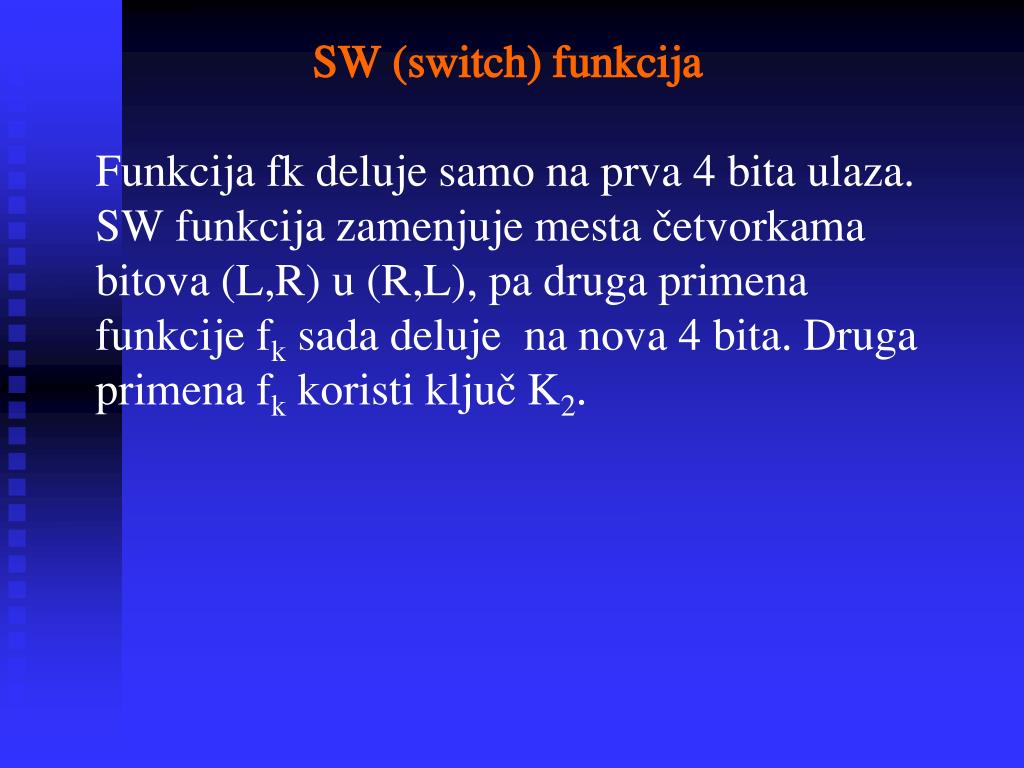 SW (switch) funkcija Funkcija fk deluje samo na prva 4 bita ulaza. SW funkcija zamenjuje mesta ~etvorkama bitova (L,R) u (R,L), pa druga primena funkcije fk sada deluje na nova 4 bita. Druga primena fk koristi klju~ K2.