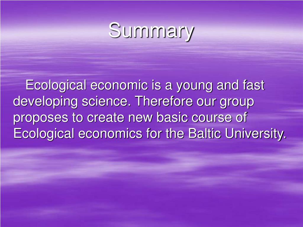 Summary Ecological economic is a young and fast developing science. Therefore our group proposes to create new basic course of Ecological economics for the Baltic University.