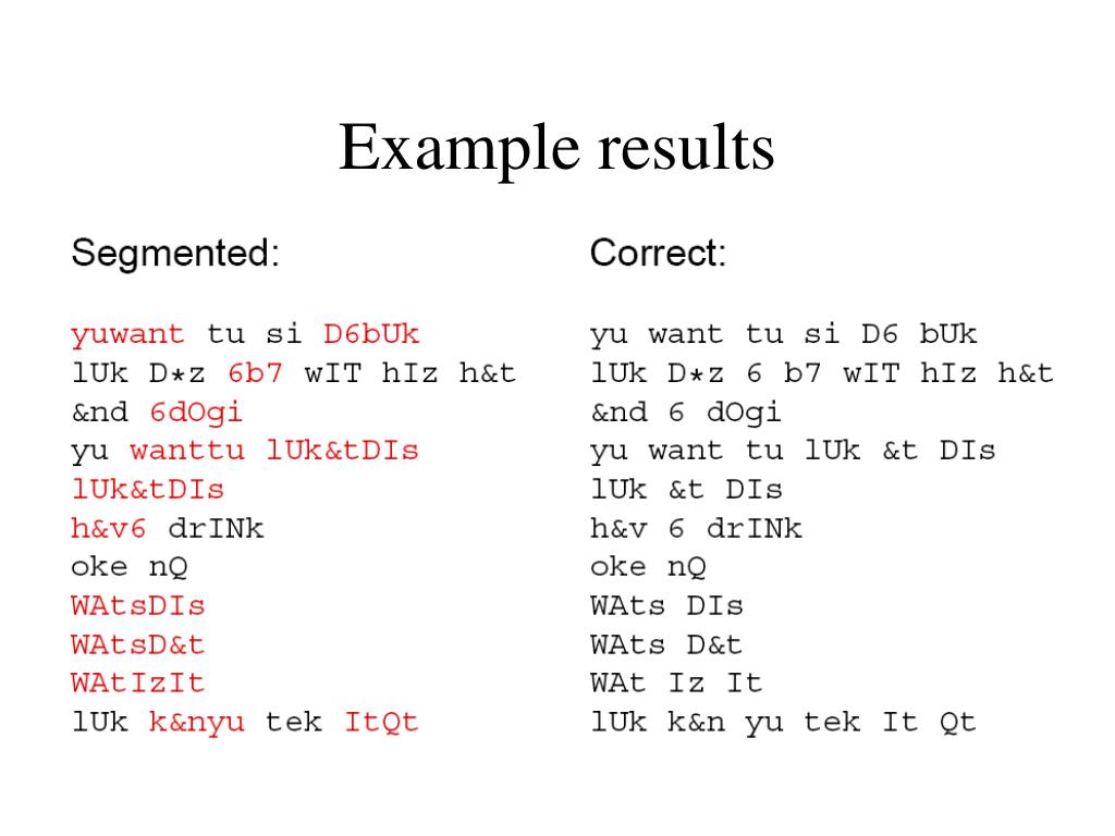 Comparison to previous results • Proposed boundaries are more accurate than Brent’s, but fewer proposals are made. • Result: word tokens are less accurate. Precision: #correct / #found= [= hits / (hits + false alarms)] Recall: #found / #true = [= hits / (hits + misses)] F-score: an average of precision and recall.