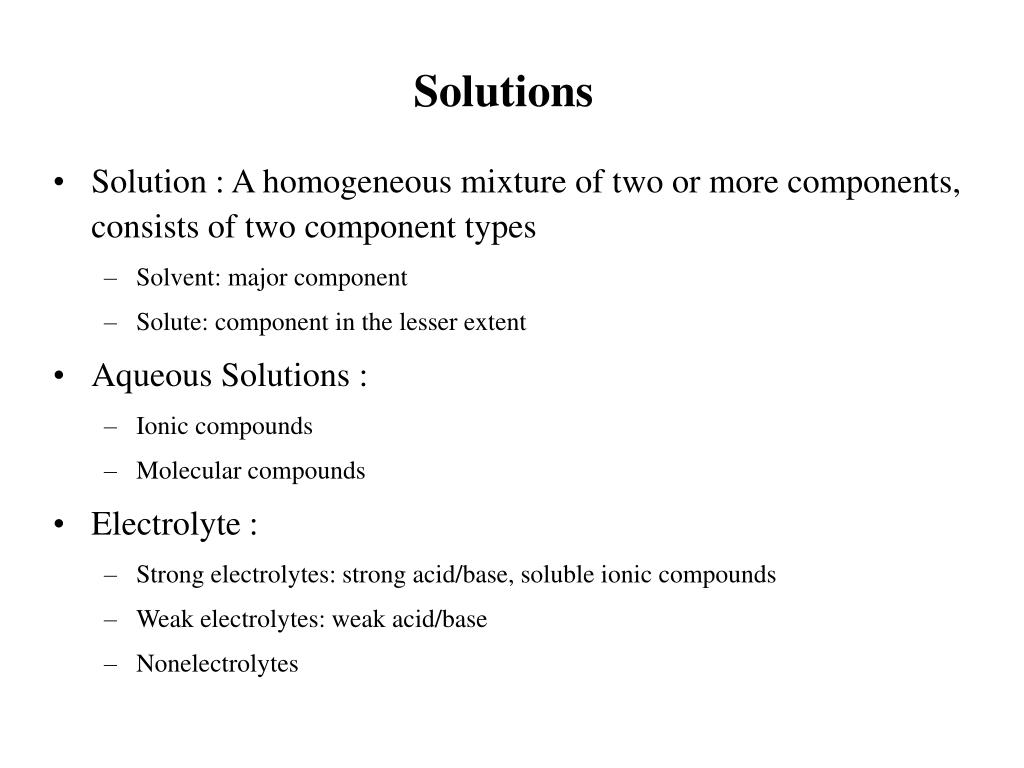 Solutions • Solution : A homogeneous mixture of two or more components, consists of two component types • Solvent: major component • Solute: component in the lesser extent • Aqueous Solutions : • Ionic compounds • Molecular compounds • Electrolyte : • Strong electrolytes: strong acid/base, soluble ionic compounds • Weak electrolytes: weak acid/base • Nonelectrolytes