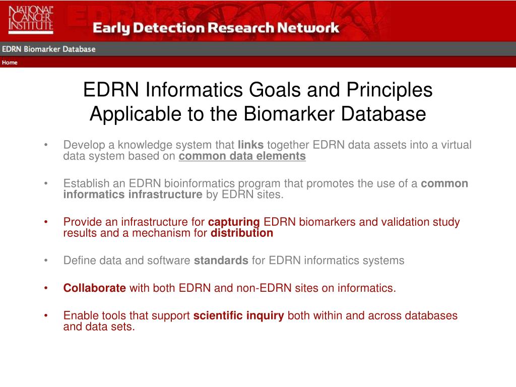 EDRN Informatics Goals and PrinciplesApplicable to the Biomarker Database • Develop a knowledge system that links together EDRN data assets into a virtual data system based on common data elements • Establish an EDRN bioinformatics program that promotes the use of a common informatics infrastructure by EDRN sites. • Provide an infrastructure for capturing EDRN biomarkers and validation study results and a mechanism for distribution • Define data and software standards for EDRN informatics systems • Collaborate with both EDRN and non-EDRN sites on informatics. • Enable tools that support scientific inquiry both within and across databases and data sets.