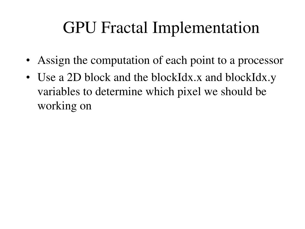 GPU Fractal Implementation • Assign the computation of each point to a processor • Use a 2D block and the blockIdx.x and blockIdx.y variables to determine which pixel we should be working on