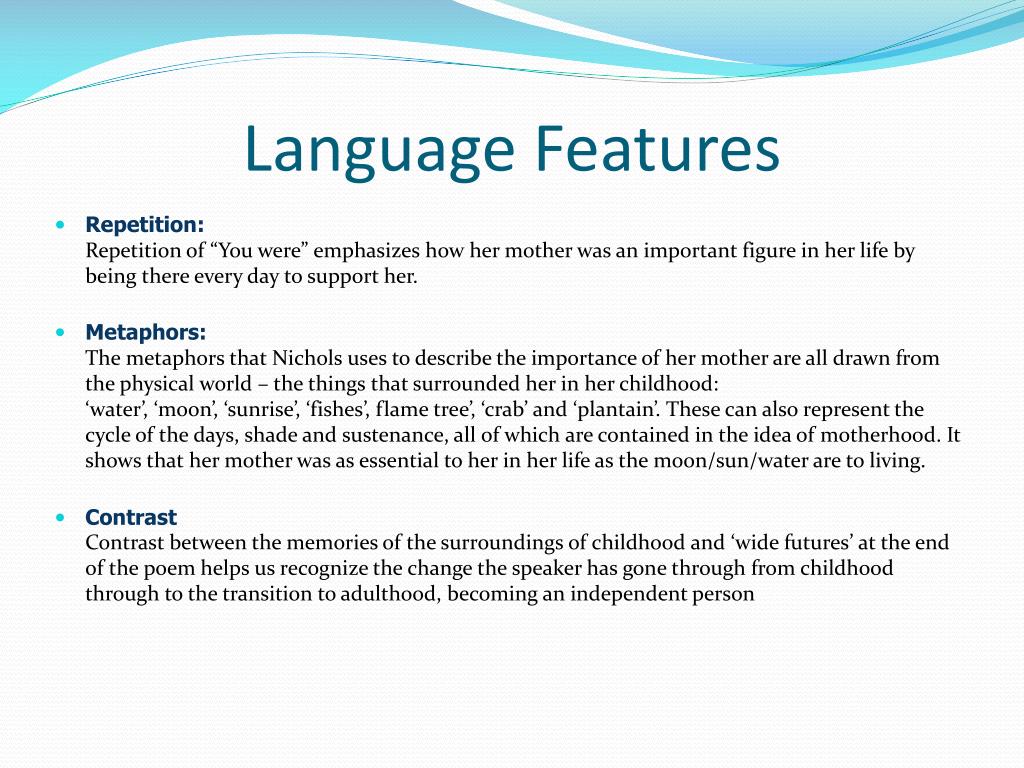 Language Features • Repetition: Repetition of “You were” emphasizes how her mother was an important figure in her life by being there every day to support her. • Metaphors:The metaphors that Nichols uses to describe the importance of her mother are all drawn from the physical world – the things that surrounded her in her childhood: ‘water’, ‘moon’, ‘sunrise’, ‘fishes’, flame tree’, ‘crab’ and ‘plantain’. These can also represent the cycle of the days, shade and sustenance, all of which are contained in the idea of motherhood. It shows that her mother was as essential to her in her life as the moon/sun/water are to living. • ContrastContrast between the memories of the surroundings of childhood and ‘wide futures’ at the end of the poem helps us recognize the change the speaker has gone through from childhood through to the transition to adulthood, becoming an independent person