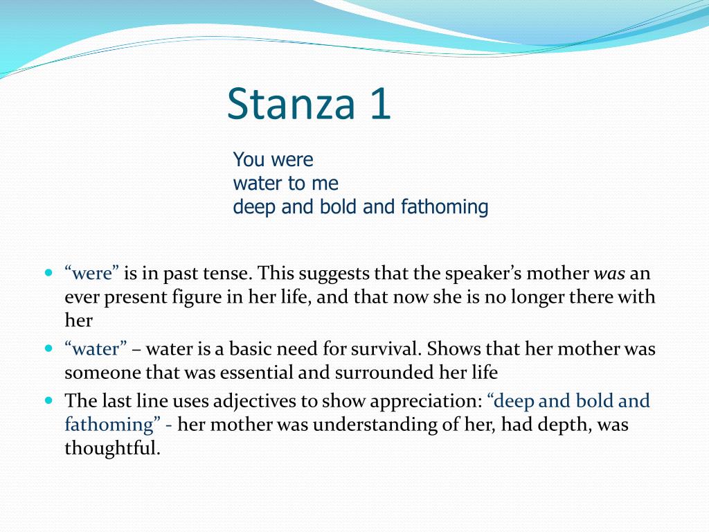 Stanza 1 You werewater to medeep and bold and fathoming • “were” is in past tense. This suggests that the speaker’s mother wasan ever present figure in her life, and that now she is no longer there with her • “water” – water is a basic need for survival. Shows that her mother was someone that was essential and surrounded her life • The last line uses adjectives to show appreciation: “deep and bold and fathoming” - her mother was understanding of her, had depth, was thoughtful.