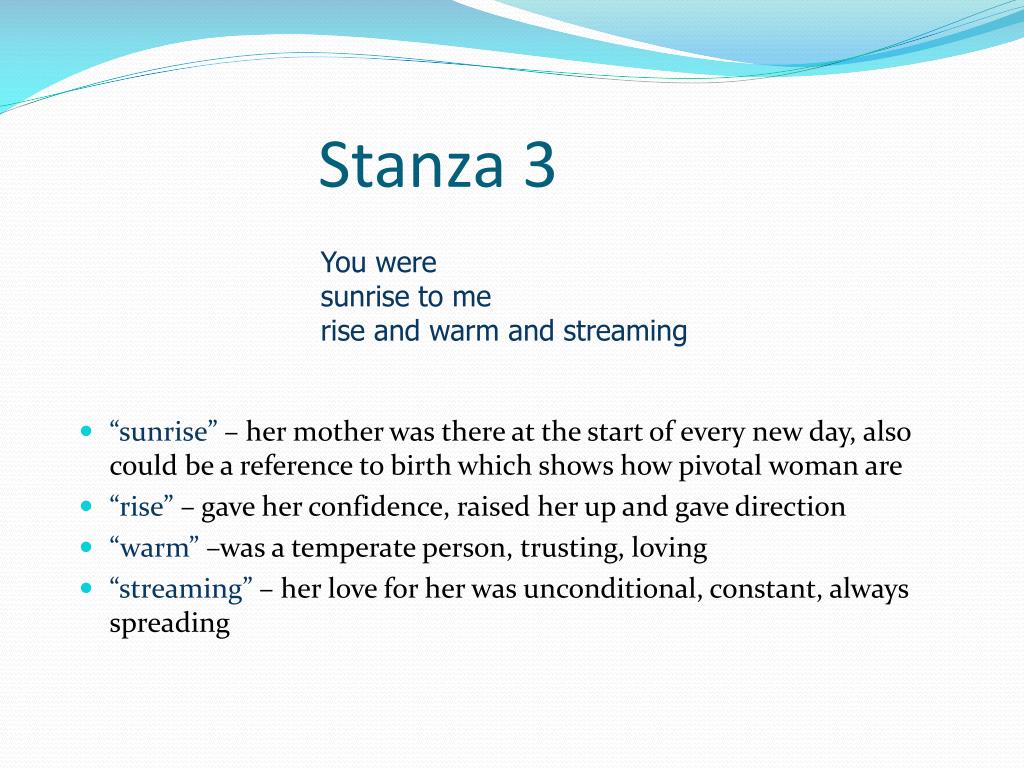 Stanza 3 You weresunrise to merise and warm and streaming • “sunrise” – her mother was there at the start of every new day, also could be a reference to birth which shows how pivotal woman are • “rise” – gave her confidence, raised her up and gave direction • “warm” –was a temperate person, trusting, loving • “streaming” – her love for her was unconditional, constant, always spreading