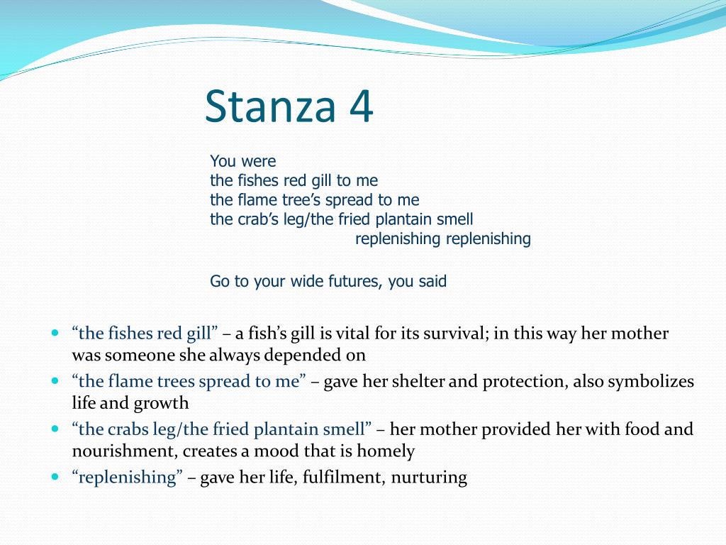 Stanza 4 You were the fishes red gill to methe flame tree’s spread to methe crab’s leg/the fried plantain smell replenishing replenishing Go to your wide futures, you said • “the fishes red gill” – a fish’s gill is vital for its survival; in this way her mother was someone she always depended on • “the flame trees spread to me” – gave her shelter and protection, also symbolizes life and growth • “the crabs leg/the fried plantain smell” – her mother provided her with food and nourishment, creates a mood that is homely • “replenishing” – gave her life, fulfilment, nurturing