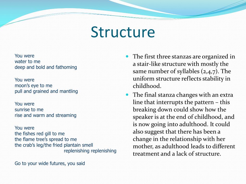 Structure You werewater to medeep and bold and fathoming You weremoon’s eye to mepull and grained and mantling You weresunrise to merise and warm and streaming You were the fishes red gill to methe flame tree’s spread to methe crab’s leg/the fried plantain smell replenishing replenishing Go to your wide futures, you said • The first three stanzas are organized in a stair-like structure with mostly the same number of syllables (2,4,7). The uniform structure reflects stability in childhood. • The final stanza changes with an extra line that interrupts the pattern – this breaking down could show how the speaker is at the end of childhood, and is now going into adulthood. It could also suggest that there has been a change in the relationship with her mother, as adulthood leads to different treatment and a lack of structure.