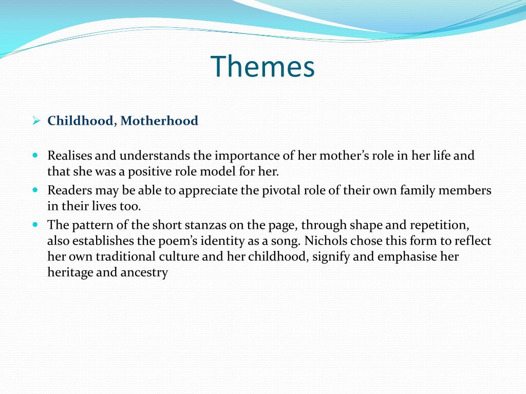 Themes • Childhood, Motherhood • Realises and understands the importance of her mother’s role in her life and that she was a positive role model for her. • Readers may be able to appreciate the pivotal role of their own family members in their lives too. • The pattern of the short stanzas on the page, through shape and repetition, also establishes the poem’s identity as a song. Nichols chose this form to reflect her own traditional culture and her childhood, signify and emphasise her heritage and ancestry