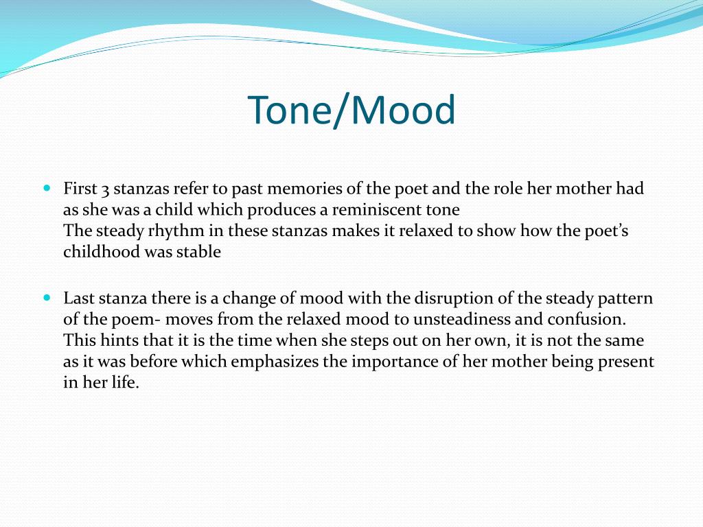 Tone/Mood • First 3 stanzas refer to past memories of the poet and the role her mother had as she was a child which produces a reminiscent toneThe steady rhythm in these stanzas makes it relaxed to show how the poet’s childhood was stable • Last stanza there is a change of mood with the disruption of the steady pattern of the poem- moves from the relaxed mood to unsteadiness and confusion. This hints that it is the time when she steps out on her own, it is not the same as it was before which emphasizes the importance of her mother being present in her life.